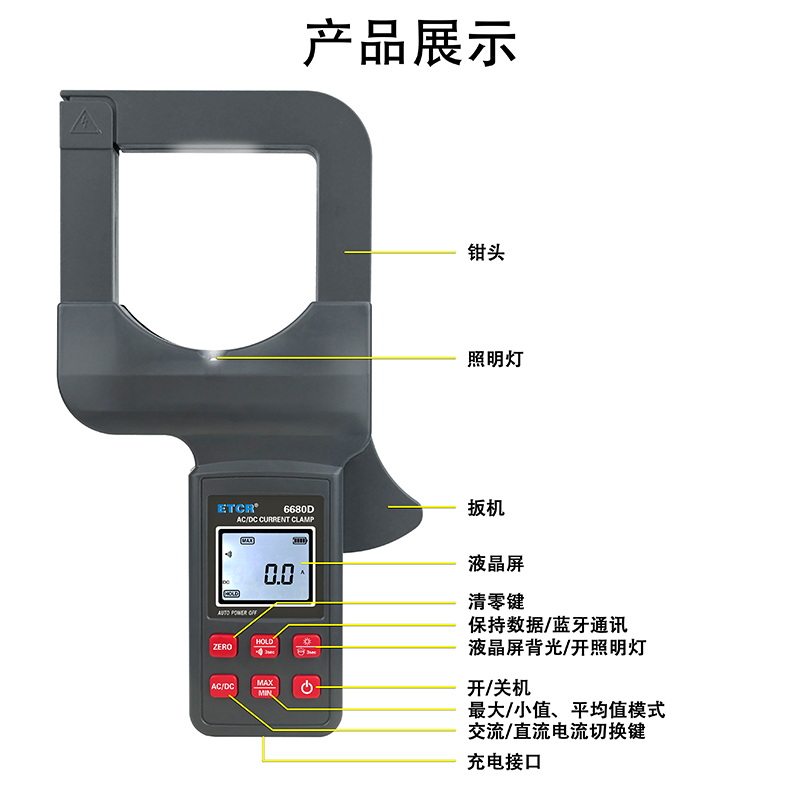 ETCR6680D大口徑直流/交流鉗形電流表鉗表具有直流/交流真有效值測量、最大值/最小值/平均值測量等功能。鉗表具有數據保持、藍牙通訊功能,使用大容量鋰電池type-c充電口,是一款新型的電工安全檢測必備工具。