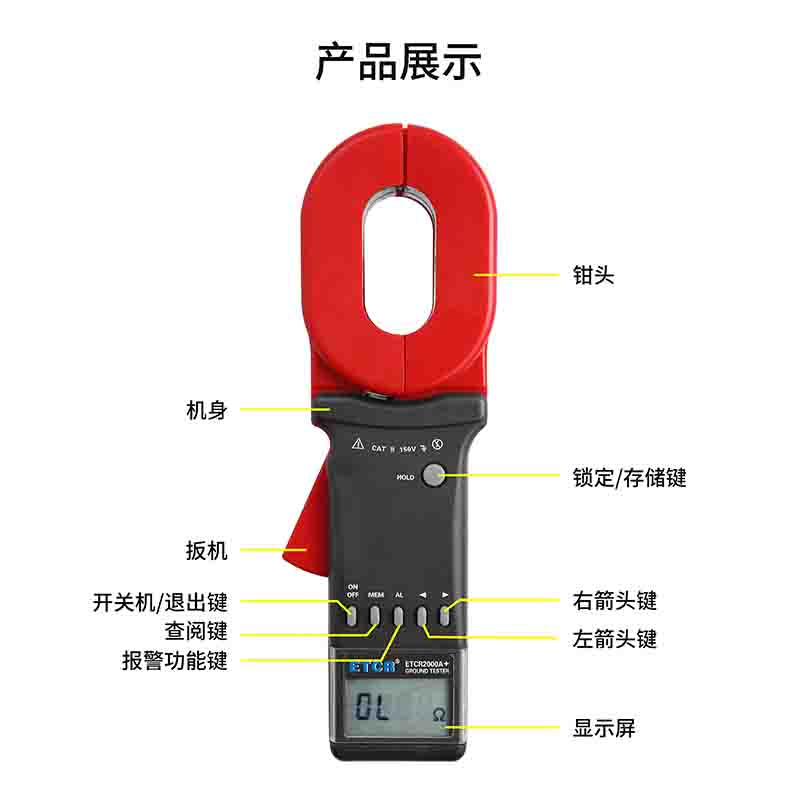 ETCR2000A+鉗形接地電阻儀能測量出用傳統方法無法測量的接地故障,能應用于傳統方法無法測量的場合,因為鉗形接地電阻儀測量的是接地體電阻和接地引線電阻的綜合值。