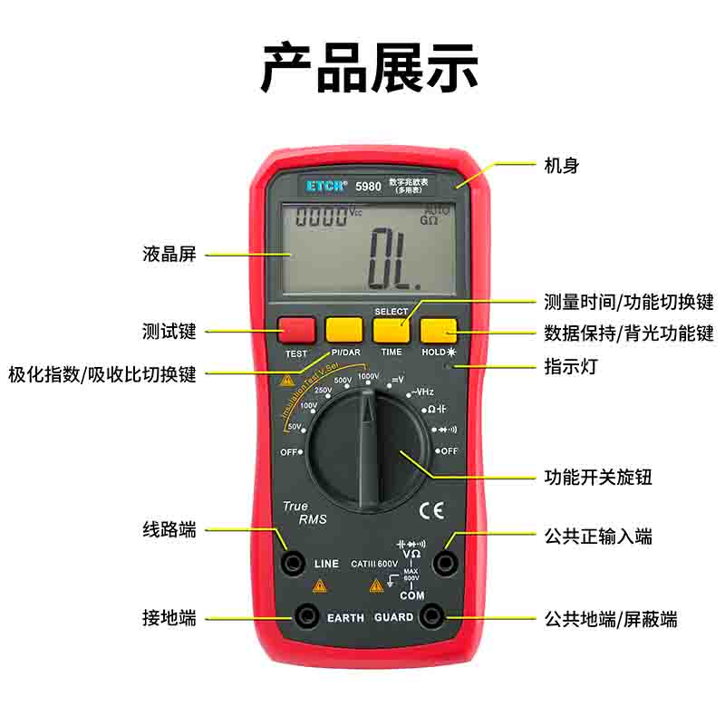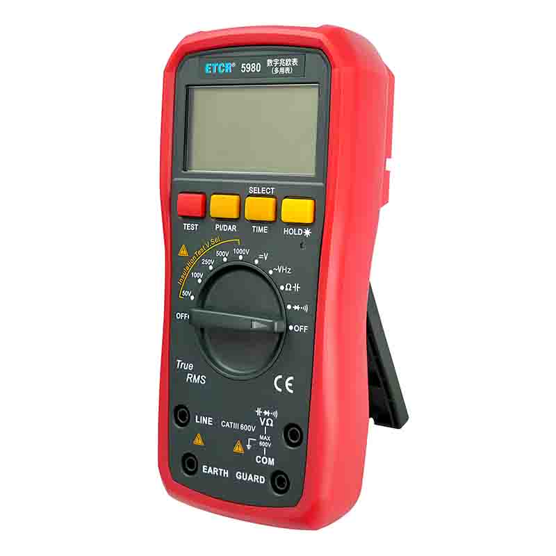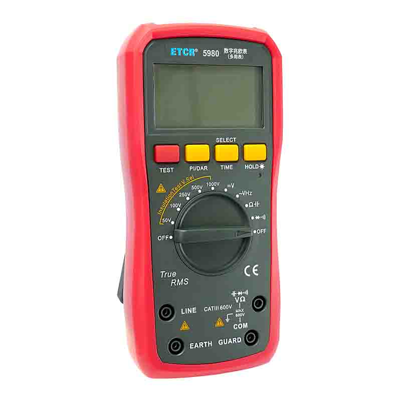 ETCR5980數字兆歐表(多用表)是一款數字式兆歐表+數字萬用表。絕緣電阻測試電壓可選50V/100V/250V/500V/1000V。它可適時監測絕緣電阻測試電壓,有效避免因輸出電壓不符合額定值要求而造成的誤判。儀表絕緣電阻測量最高可達到20GΩ,可根據需要設置測量時間,測量完畢后自動保持測量結果。數字多用表功能有交直流電壓、電阻、電容、頻率、二極管及通斷測量等。本產品適用于測量變壓器、電機、電纜、開關、電器等各種電氣設備及絕緣材料的絕緣電阻,對各種電氣設備進行保養維修、試驗及檢定。它結構精巧,攜帶方便,是您理想的電工、電子測試儀表。