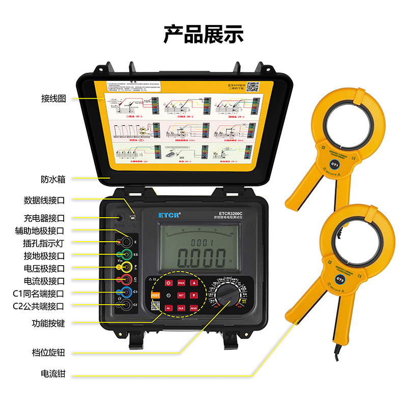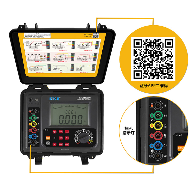 ETCR3200C雙鉗多功能接地電阻測試儀由主機、電流鉗(雙鉗)、測試線、輔助接地棒、通訊軟件、通訊線等組成。主機超大LCD顯示,具有背光、棒圖指示,一目了然。儀表具有存儲功能,時鐘功能,自動存儲含有時間的測試結果2000組。儀表具有支持安卓系統的藍牙通信功能,安裝APP后可在移動終端進行測試或讀取測試記錄,給你帶來全新體驗。儀表具有USB通信,存儲數據通過USB接口上傳PC機,通訊軟件可以實現歷史記錄數據讀取、查閱、保存、報表、打印等功能。儀表廣泛應用于電力、電信、氣象、油田、建筑、防雷及工業電氣設備等行業。