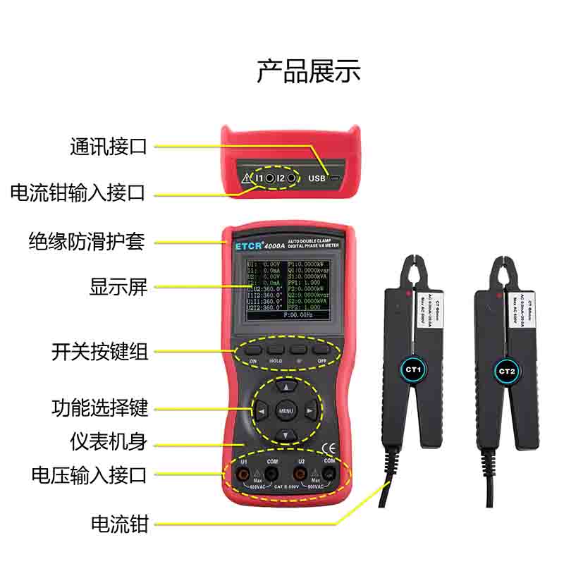 ETCR4000A智能型雙鉗數(shù)字相位伏安表采用2.8寸TFT彩色液晶屏,所有參數(shù)同屏顯示,一目了然。是對機(jī)械旋鈕式相位伏安表的全面升級,減少了操作的繁瑣性,降低了誤操作的可能性,測試精度高、使用方便。儀表配有的防振防滑高絕緣護(hù)套,USB通訊接口,可存儲1200組數(shù)據(jù),通過系統(tǒng)軟件上傳所存數(shù)據(jù)到電腦,實(shí)現(xiàn)在線實(shí)時(shí)監(jiān)測與歷史查詢,讀取、保存、報(bào)表、打印歷史數(shù)據(jù)等。