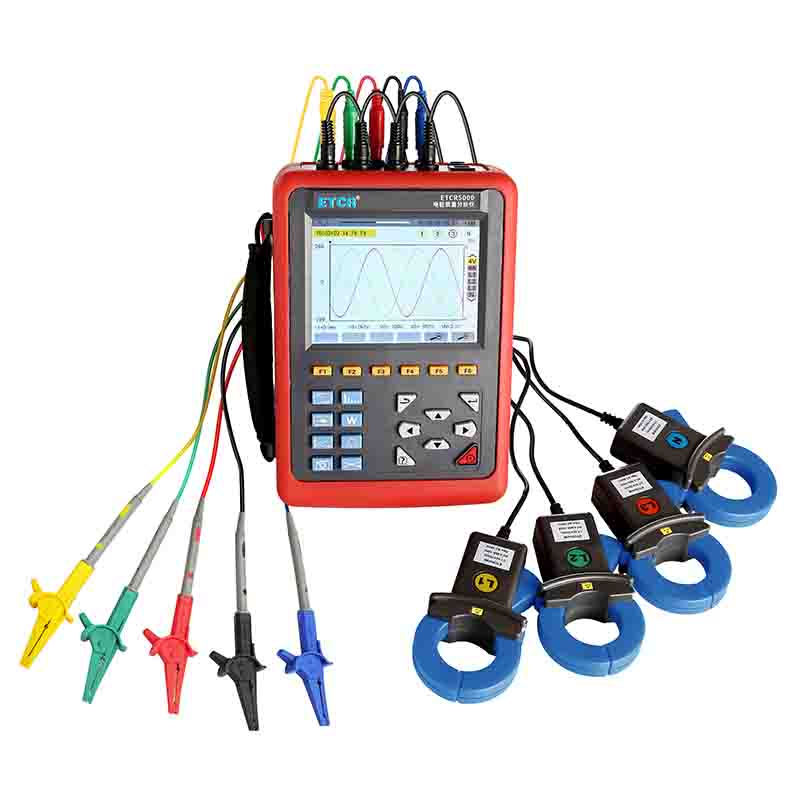 ETCR5000電能質量分析儀又稱電力質量分析儀、電力參數測試儀、諧波分析儀,是一款專為現場測試三相電能參數的多功能、智能化綜合型測試儀器。可同時測量4路電流(ABC三相及中性線電流),4路電壓(ABC三相電壓及中性線對地電壓)、電流電壓的峰值、一段時間內的最大最小值、三相不平衡度、短時電壓閃變、變壓器K因數、有功功率、無功功率、視在功率、功率因數、位移功率因數、有功電能、無功電能、視在電能、諧波比、總諧波失真度等;顯示電流電壓的實時波形、相量圖、諧波比柱形圖;動態捕捉電壓電流瞬時變化,監測啟動電流,監測各電力參數并生成告警列表,長時間記錄測試數據并生成趨勢曲線圖等功能。適用于電力、石化、冶金、鐵路、工礦企業、科研院校、計量部門等。