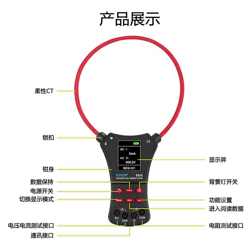 ETCR6920柔性電流鉗表又名柔性線圈鉗表、超大電流鉗表、羅氏線圈電流鉗表、洛氏線圈電流鉗表,用于交流電流測試、電壓測試、電阻測試、通斷測試。柔性線圈無任何裸露金屬導體,體積小、重量輕、柔軟靈活,特別適合大尺寸導體、狹窄環境和排線密集的場所,可用于信號嚴重畸變的工業環境電流測試。廣泛適用于電力、通信、氣象、鐵路、油田、建筑、計量、科研教學單位、工礦企業等領域。