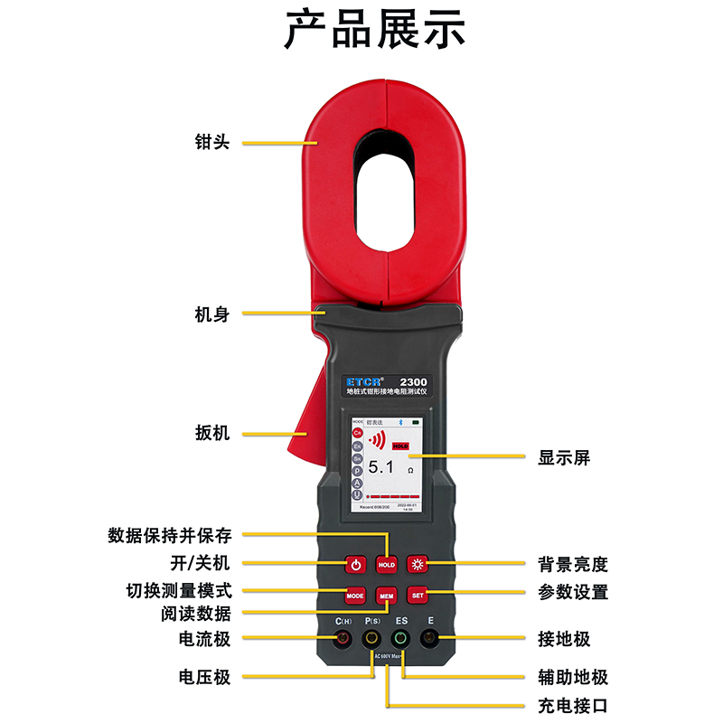 ETCR2300地樁式鉗形接地電阻表采用大口徑電流鉗設計,可應對各種場合的測試需求,可測量大尺寸接地引下線的接地電阻值,可測量單點和網狀接地等各種復雜接地結構的接地電阻值,測量并聯接地系統時無需斷開任何并聯接地極,極大地提高了測量的方便性,為接地性能測試提供了完美的解決方案。
