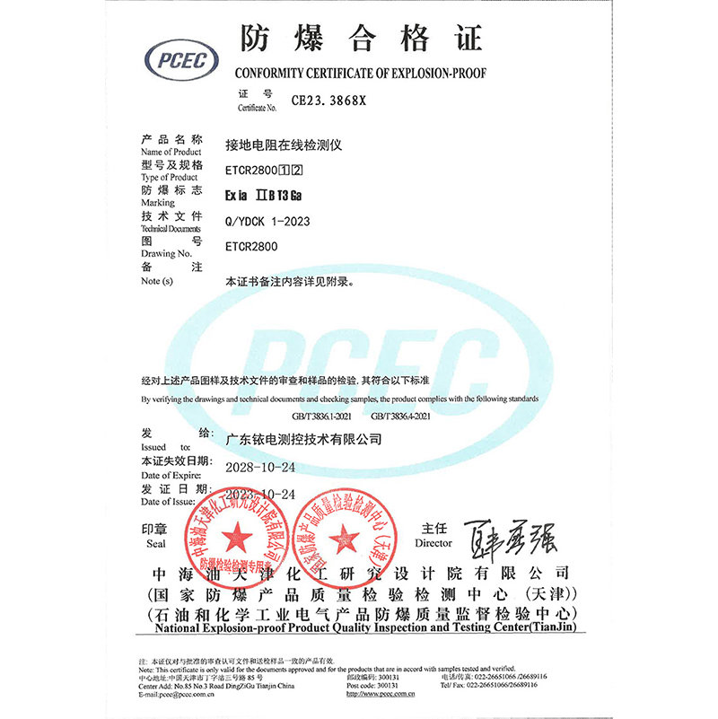 ETCR2800系列接地電阻在線檢測儀已通過防爆認(rèn)證,其安全防爆認(rèn)證參數(shù)整機(jī)滿足GB3836.1-2021和GB3836.4-2021標(biāo)準(zhǔn)相關(guān)要求。其防爆標(biāo)志為Ex iaⅡB T3 Ga、 Ex ib IIC T4 Gb。防爆合格證號:CE23.3868X。它可應(yīng)用于相應(yīng)的易燃易爆環(huán)境中。