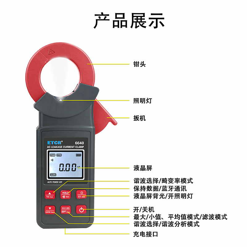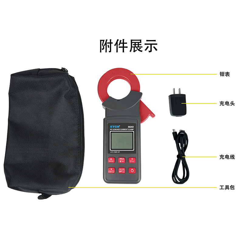 ETCR6640鉗形漏電流表可測試40Hz~1kHz頻率范圍的電流。鉗表還具有背光、手電筒、數(shù)據(jù)存儲、藍牙通訊等功能。鉗表使用大容量鋰電池type-c充電口,是一款新型的電工安全檢測必備工具。