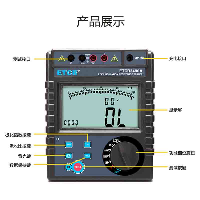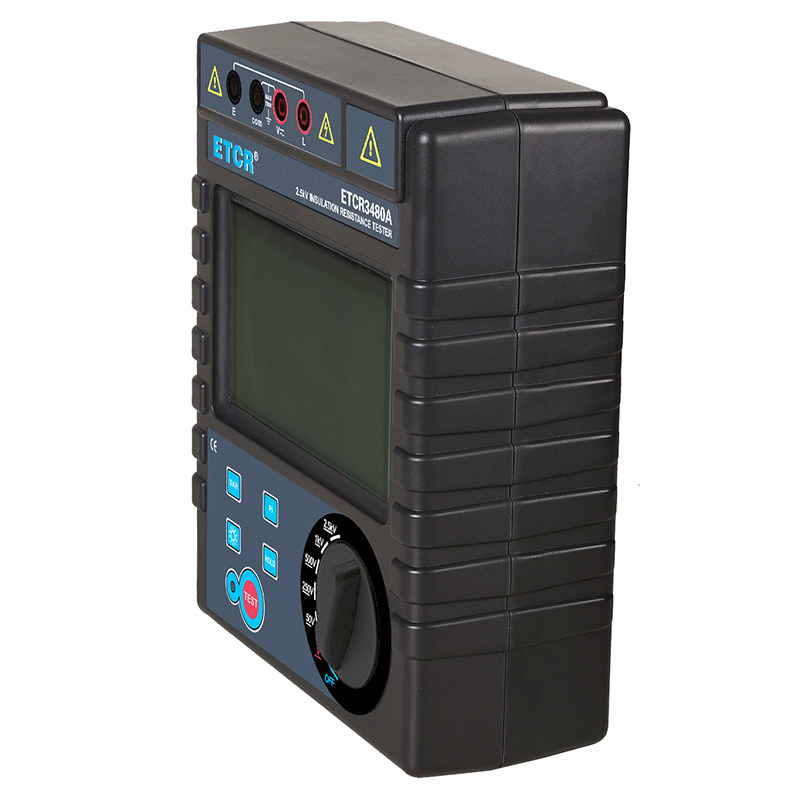 ETCR3480A絕緣電阻表又名兆歐表、絕緣電阻測試儀,用于絕緣電阻測試、吸收比、極化指數(shù)測試、交直流電壓測試。儀表具有LCD大屏幕帶背光顯示、數(shù)據(jù)保持、自動放電、自動關機等功能。儀表具有測試計時,電壓監(jiān)測功能,回路電壓大于36V時,儀表將禁止測試以保護被測物及人員安全。儀表功能操作簡易,絕緣電阻值,測試時間,輸出電壓同屏顯示,具備交流電壓、直流電壓測試功能。