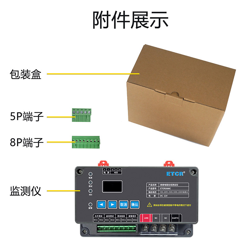 | ETCR3580C絕緣電阻在線監(jiān)測儀 | 50V、100V、250V、500V、1000V、自定義 | 0.1MΩ~20GΩ | 5mA MAX | 1路 | RS485 |