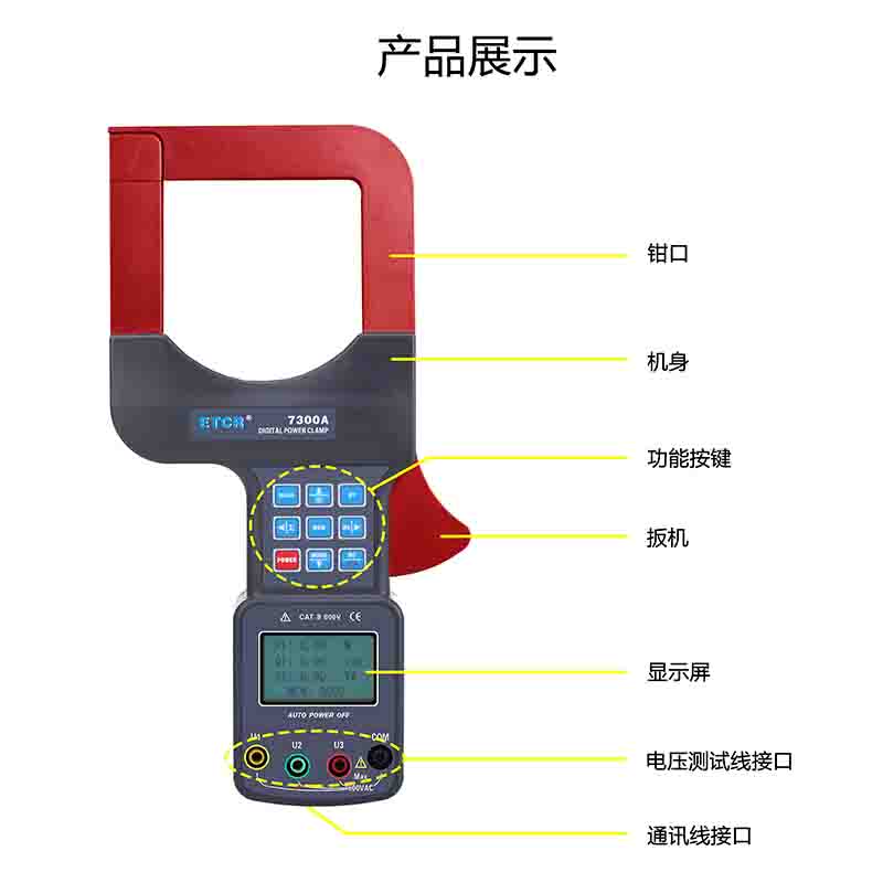 ETCR7300A大口徑三相鉗形功率表又名鉗形功率計、超大口徑鉗形功率表、三相鉗形功率表,用于現場測量三相交流電壓、電流、電壓間相位、電壓電流間相位、頻率、相序、電能、有功功率、無功功率、視在功率、功率因數、總功率等電能參數。還能用于判別變壓器接線組別、感性、容性電路,讀出差動保護各組CT之間的相位關系,檢查電度表的接線正確與否,檢修線路設備等,為用電檢查人員提供一種安全、準確、便捷的新型電力儀表。