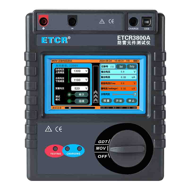 ETCR3800B智能型防雷元件測試儀又稱防雷元件測試表、SPD現(xiàn)場測試儀、壓敏電阻測試儀、浪涌保護(hù)器測試儀,用于測量各種壓敏電阻(MOV)、氣體放電管(GDT)、浪涌保護(hù)器(SPD)性能參數(shù)測試,還具有絕緣電阻、吸收比、極化指數(shù)測試功能。儀表具有獨(dú)特的高壓短路保護(hù)、過流保護(hù)功能,專業(yè)級的參數(shù)設(shè)置功能、高壓限值設(shè)定、升壓速度設(shè)定、合格范圍設(shè)定、合格判斷篩選、自動量程調(diào)節(jié)等功能。還具有單件測試模式、連續(xù)測試模式功能,特別適合批量元件測試。儀器廣泛用于避雷器、防雷器、浪涌保護(hù)器、壓敏電阻、金屬陶瓷放電管、真空避雷管等過壓防護(hù)元件性能參數(shù)的測試。是氣象防雷、電力、通信、機(jī)電安裝和維修、防雷元件生產(chǎn)廠家、以及工業(yè)企業(yè)部門常用必備的儀表。