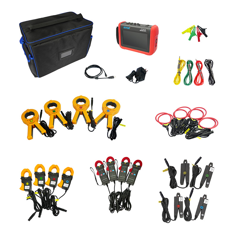 ETCR5230電能質量分析儀是我公司精心研制的一款專為現場測試三相電能質量的高精度綜合型測試儀器。儀表具有智能化、功能完善、人機操作簡潔、中英文雙語操作界面等特點。儀表采用7寸觸摸彩屏、體積小重量輕、攜帶方便,可選配多款電流鉗。儀表可同時測量4路電流(ABC三相及中性線電流),3路電壓、三相不平衡度、有功功率、無功功率、視在功率、諧波比、總諧波失真度等;顯示電流電壓的實時波形、相量圖;動態捕捉電壓電流瞬時變化,監測啟動電流,監測各電力參數并生成告警列表,長時間記錄測試數據并生成趨勢曲線圖等功能。
