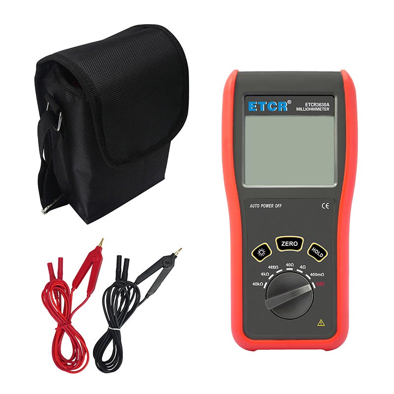 ETCR3630A便攜式毫歐計又稱直流低電阻計、直流電阻測試儀,歐姆計,儀表采用微處理機技術,四線法測試,安全精密可靠。主要用于測量電纜的導線電阻,開關、接插件、繼電器的接觸電阻,線圈、電動機、變壓器繞組的直流低電阻,金屬鉚接件金屬構件之間,地網地極連接導體間的聯接電阻。儀表廣泛應用于工礦企業、建筑監測監理公司、建筑施工單位、防雷公司、電力部門、船舶機車廠等。ETCR3630A便攜式毫歐計由主機、測試線組成。主機大屏LCD顯示,一目了然。能存儲1000組數據,電阻測量范圍:0.1mΩ~40.0kΩ,最大測試電流:100mA,儀表操作簡易,攜帶方便。