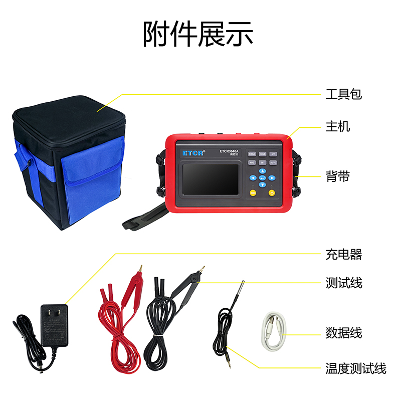 隨機附件 | 測試儀:1臺;測試線:2條;溫度測試線:1條;USB通信線:1條;充電器:1個;工具包:1件 |
