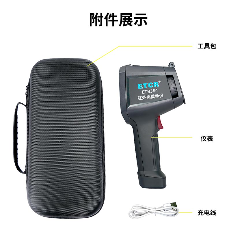 ETB384紅外熱成像儀是表面溫度測量和實時熱圖像相結合的紅外熱成像儀。傳統的紅外測溫儀需要逐一測量每個部件,而紅外熱成像儀則無需如此,從而節省了時間。潛在問題可清晰地顯示在彩色顯示屏上,而且通過中心點測量光標能快速準確地定位并測量目標物體的溫度。