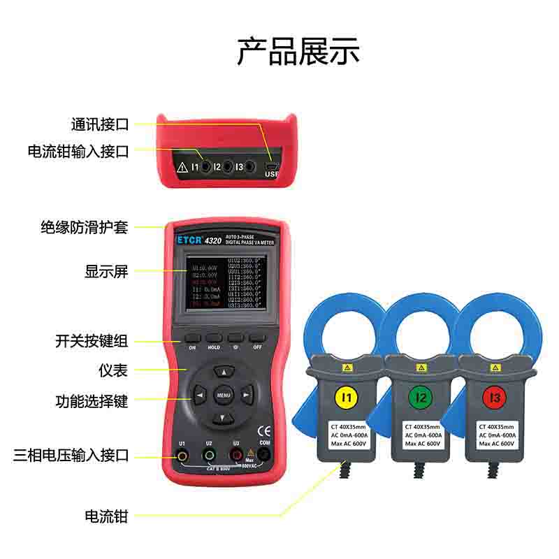 ETCR4320大口徑三相數(shù)字相位伏安表又稱三鉗相位伏安表、三相相位伏安測試儀、手持式相位測試儀、便攜式相位表 、矢量圖分析儀,用于同時(shí)測量三相交流電壓、電流、電壓間相位、電流間相位、電壓電流間相位、頻率、相序、有功功率、無功功率、視在功率、功率因數(shù)、電流矢量和,判別變壓器接線組別、感性、容性電路,測試二次回路和母差保護(hù)系統(tǒng),讀出差動(dòng)保護(hù)各組CT之間的相位關(guān)系,檢查電度表的接線正確與否,檢修線路設(shè)備等,為用電檢查人員提供一種安全、準(zhǔn)確、便捷的新型電力儀表。尤其適用于電能計(jì)費(fèi)系統(tǒng)及繼電保護(hù)系統(tǒng)。