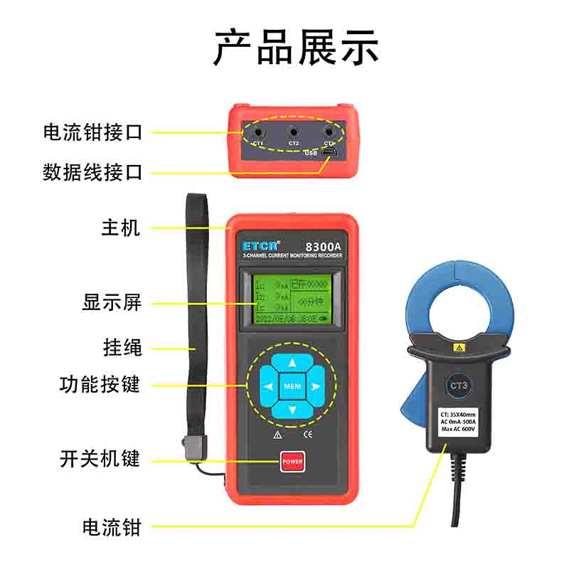 | ETCR8300A三路鉗形電流記錄儀 | 35mm×40mm | AC 0mA~500A | 7天 | 1秒-99分鐘 | 20萬組 | 鋰電池 | 有 |