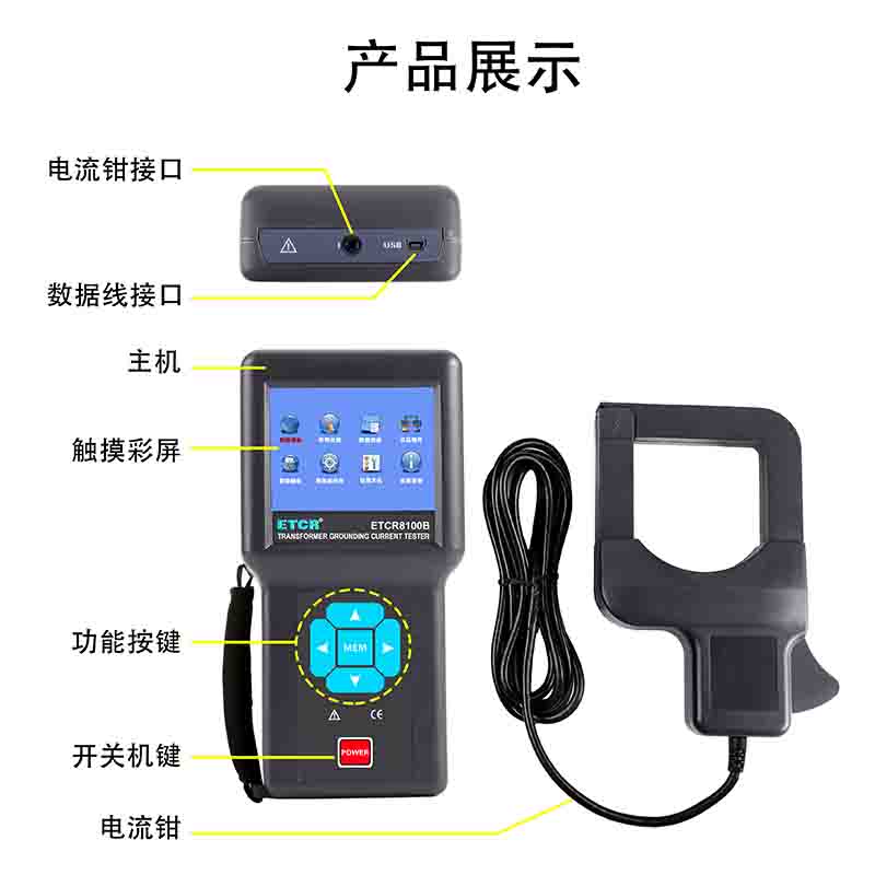 | ETCR8100B變壓器鐵芯接地電流測試儀 | AC 0.00mA~100A | 10Hz~1000Hz | 80mm×80mm | 可設置報警閾值 | 100組 |