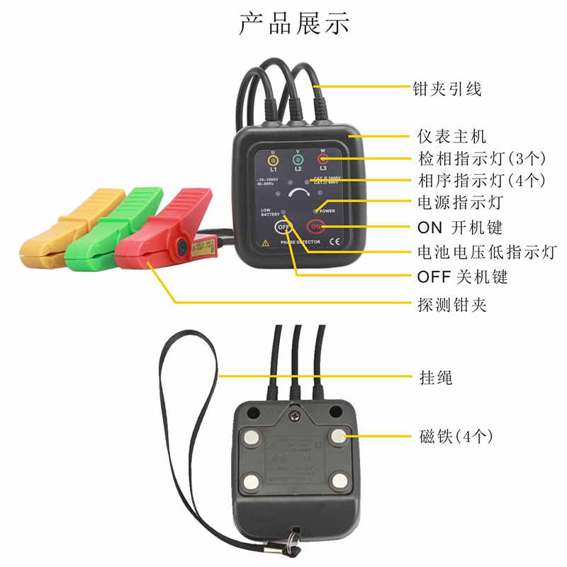 ETCR1000C非接觸型檢相器背面附有四顆強力磁鐵,可吸掛于配電箱上使用。儀表檢測快捷、方便,顯示一目了然,大大提高了現場測試的安全性,切實保護了操作人員的人身安全,增長了生產力,是三相電源相序、電機檢測、線路檢修的必備儀器。